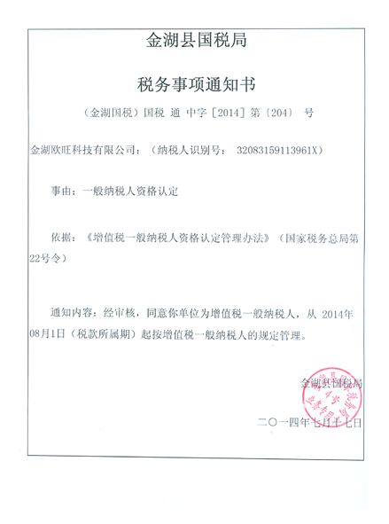 • 一般納稅人認(rèn)定稅務(wù)通知書(shū)