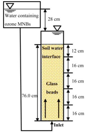 在內(nèi)徑為12 cm 的有機玻璃圓筒(圖1)中進行了柱測試, 以研究臭氧MNB處理受有機物污染的地下水。將玻璃珠與甲基橙溶液以10 mg / L的初始濃度混合,以模擬被有機物污染的土壤和地下水。的比重的玻璃珠是2.43,平均直徑為60微米,干密度為1.43 克/厘米3 。的水力傳導(dǎo)率為1.3 × 10 -4米/秒,因為玻璃珠進行分級很差,其表示介質(zhì)的沙子。土壤樣品的高度為76 分別在距底部16 厘米,32 厘米,48 厘米和64 厘米處分布有4個采樣口#1,#2,#3和#4 。去離子水中不斷產(chǎn)生臭氧MNB,以確保臭氧MNB的數(shù)量保持在峰值。含有臭氧的MNB的水從底部以0.368 的水力梯度i向上供入塔中。不使用MNB的去離子水用于對比測試。每個測試進行兩次以確保數(shù)據(jù)的可重復(fù)性。