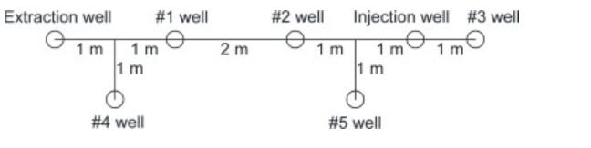 一臺抽采井,一臺注入井和五個監(jiān)控井(其位置如圖2所示)用于原位修復(fù)。 很初的地下水流向是從注入井到提取井。每個井的深度為16 m,篩選間隔為12 m至16 m。提取井的直徑為25 cm,將提取速率為36 L / min 的泵放置在井內(nèi)15 m 的深度處。注入井和監(jiān)測井的直徑為5 厘米。注入井與注入單元相連,注入率為15 升/分鐘 由于注入速率受場地和設(shè)施條件的限制,因此采用了較高的抽取速率以產(chǎn)生更強的地下水流。處理殘留的水并將其排放到遠離測試區(qū)域的地方。在監(jiān)測井中安裝了地下水采樣器,以收集15 m 深度的樣品。