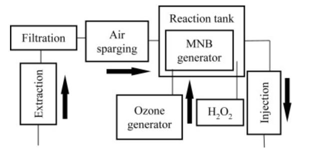 開發(fā)了現(xiàn)場修復(fù)設(shè)備(圖3 )用于現(xiàn)場測試。修復(fù)系統(tǒng)包含三個部分:提取單元,反應(yīng)單元和注射單元。從該地點提取受污染的地下水,并進行過濾以除去土壤顆粒。過濾后,用空氣噴射裝置處理地下水以除去三氯乙烯。隨后,將處理過的地下水注入到反應(yīng)罐中。MNB發(fā)生器位于水箱內(nèi)部,用于原位產(chǎn)生臭氧MNB。在產(chǎn)生臭氧MNB的過程中,以1∶1的臭氧∶H 2 O 2的質(zhì)量比添加H 2 O 2試劑。臭氧MNB和H 2 O之后添加2份水,通過注入單元將水注入地面。從反應(yīng)罐到進樣單元的流量為15 L / min,停留時間為33.3 min,以實現(xiàn) 很佳的MNB生成。從當(dāng)?shù)貢r間每天09:00到18:00進行了六天的原位地下水修復(fù)。對地下水進行采樣以監(jiān)測三氯乙烯的濃度。