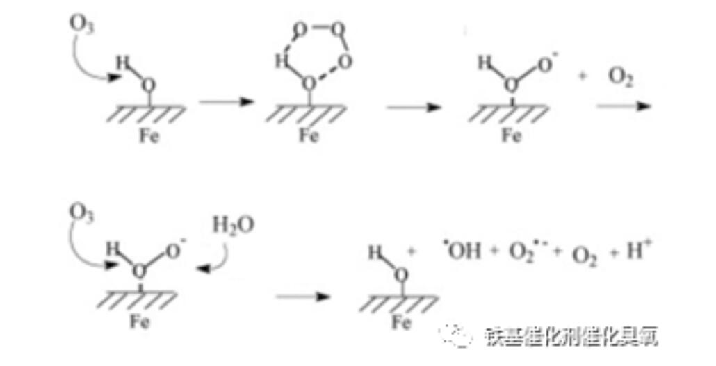 這張圖,是我根據(jù)該論文改繪的(見文獻(xiàn):Tao Zhang, Jun Ma∗. Catalytic ozonation of trace nitrobenzene in waterwith synthetic goethite. Journal ofMolecular Catalysis A: Chemical 279 (2008), 82–89),原理未動,主要是為配合上述化學(xué)反應(yīng)式,稍做改動。由此我認(rèn)為:不論是臭氧在液相、還是在催化劑表面,形成自由基反應(yīng)步驟是一樣的。