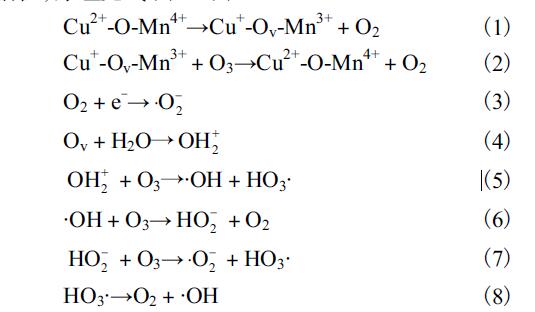 Cu 摻雜會(huì)增加比表面積,改變化學(xué)鍵,并促進(jìn)多價(jià)金屬的轉(zhuǎn)化和氧空位的產(chǎn)生[12].加入Ce 后,催化劑中的小半徑的Cu-Mn 取代了CeO2 中的大半徑的Ce,進(jìn)入到CeO2晶格中,從而產(chǎn)生很多的表面空位,形成缺陷結(jié)構(gòu),加快了供氧速度,從而提高了催化劑活性,促進(jìn)對O3的轉(zhuǎn)化率[13–14].Mn 與Cu 的氧化物復(fù)配會(huì)產(chǎn)生錳銅固溶體,從而導(dǎo)致晶格氧的缺陷,有效地改善了催化劑吸附和活化氧的能力,并且通過兩者的復(fù)配形成的銅錳尖晶石將進(jìn)一步提高催化劑的活性,原理見式(1)—(8).