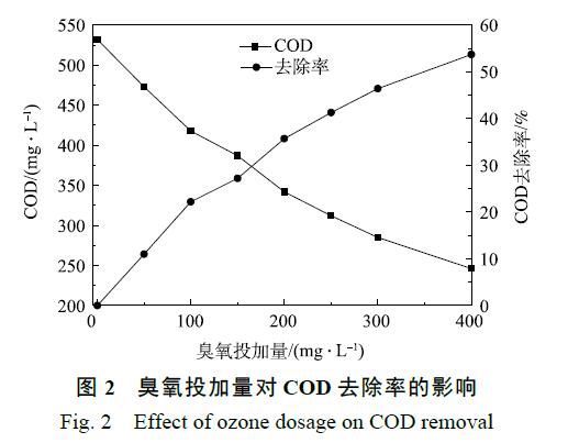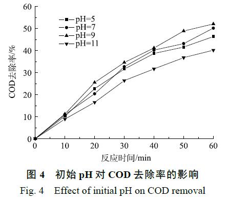 實驗選取了 4 個不同的 pH,用 NaOH 調(diào)節(jié)廢水 pH,臭氧催化氧化時間為 60 min,臭氧的投加量為 300 mg·L−1。由 圖 4 可知,初 始 pH 對臭氧催化氧化降 解COD 的影響較大,隨著 pH 的升高,COD 的去除率呈上升趨勢,當(dāng)初始 pH 從 5 升到 9 時,COD 的去除率從 46.4% 升至 52.1%。臭氧間接氧化較多發(fā)生在中、堿性條件下,臭氧在堿性條件下很不穩(wěn)定,易促進其自身分解[18],可通過自發(fā)的一系列鏈?zhǔn)椒磻?yīng)生成強氧化性的·OH[19],更有利于 COD 的去除。此外隨著廢水pH 的升高,水中 OH−濃度增加,加劇了臭氧分解產(chǎn)生·OH。