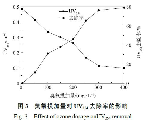 臭氧催化氧化實驗在室溫下進行,廢水初始 pH 為 5,反應(yīng)時間為 60 min,通過調(diào)節(jié)臭氧進氣濃度控制臭氧的投加量,圖 2 和圖 3 為不同臭氧投加量條件下水中有機物的降解情況。由圖 2 可知,隨著臭氧投加量的增加,水中 COD 的去除率不斷升高,當(dāng)臭氧投加量增 至 400 mg·L−1 時 , COD由 532 mg·L−1 降 至 246 mg·L−1, UV254 由 0.468降至 0.098,COD 和 UV254 的去除率分別升至53.7% 和 79.1%。COD 和 UV254 的去除率隨著臭氧投加量的增加而逐步升高,當(dāng)臭氧投加量增到 300 mg·L−1 時,COD 和 UV254 的去除率開始趨于平緩,臭氧的利用率開始下降。臭氧催化氧化主要通過臭氧催化產(chǎn)生·OH,通過·OH 氧化水中有機物。隨著臭氧投加量的增加,有機物不斷被降解,隨著水中可被氧化的有機物的減少,·OH 與有機物發(fā)生碰撞的概率降低[17],從而導(dǎo)致臭氧的利用率下降。