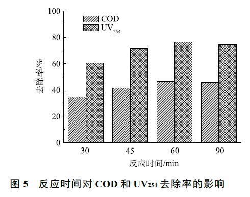 臭氧催化氧化實驗在室溫下進行,在廢水初始 pH 為 5,通過調(diào)節(jié)臭氧進氣濃度控制臭氧投加量為 300 mg·L−1 的條件下,考察了臭氧催化氧化時間對有機物去除效果的影響,結(jié)果如圖 5 所示。當(dāng)反應(yīng)時間從 30 min 增至 60 min 時,COD 和 UV254 的去除率分別從 34.6%、60.4% 升高到 46.4%、76.3%,有機物的去除率隨反應(yīng)時間的延遲而增加。這是由于·OH 在水中的壽命很短 [22],大約 為 10−9 s,臭氧催化氧化中·OH 氧化反應(yīng)實際發(fā)生在催化劑周圍,在傳質(zhì)不充分的反應(yīng)條件下,部分·OH 在未知有機物發(fā)生反應(yīng)之前就已經(jīng)被淬滅。當(dāng)臭氧催化氧化時間縮短時,單位時間內(nèi)臭氧投加量加大,產(chǎn)生的·OH 增多,導(dǎo)致大量·OH 未參與反應(yīng)就淬滅,從而導(dǎo)致有機物去除率下降。當(dāng)反應(yīng)時間到達(dá)一定的臨界點時,再延長反應(yīng)時間,其去除率增加不再明顯,臭氧催化氧化反應(yīng)從 60 min延長至 90 min 時,COD 和 UV254 的去除率基本不變。