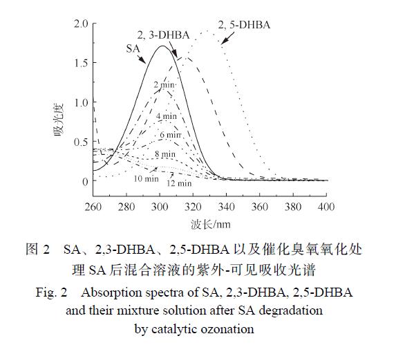 圖 2為 SA、2,3-DHBA和 2,5-BHBA的紫外-可見吸收光譜圖以及 CaO催化臭氧氧化處理后的紫外-可見吸收光譜。可以看出,SA在 302 nm處有 很大吸收峰,而 2,3-DHBA和 2,5-DHBA分別在315 nm和 330 nm處出現(xiàn) 很大吸收峰,SA經(jīng)過催化臭氧氧化處理后 很大吸收峰波長(zhǎng)向右移動(dòng),在2,3-DHBA和 2,5-DHBA的大吸收峰處有一定的吸收,證明在該過程中有 · OH產(chǎn)生。