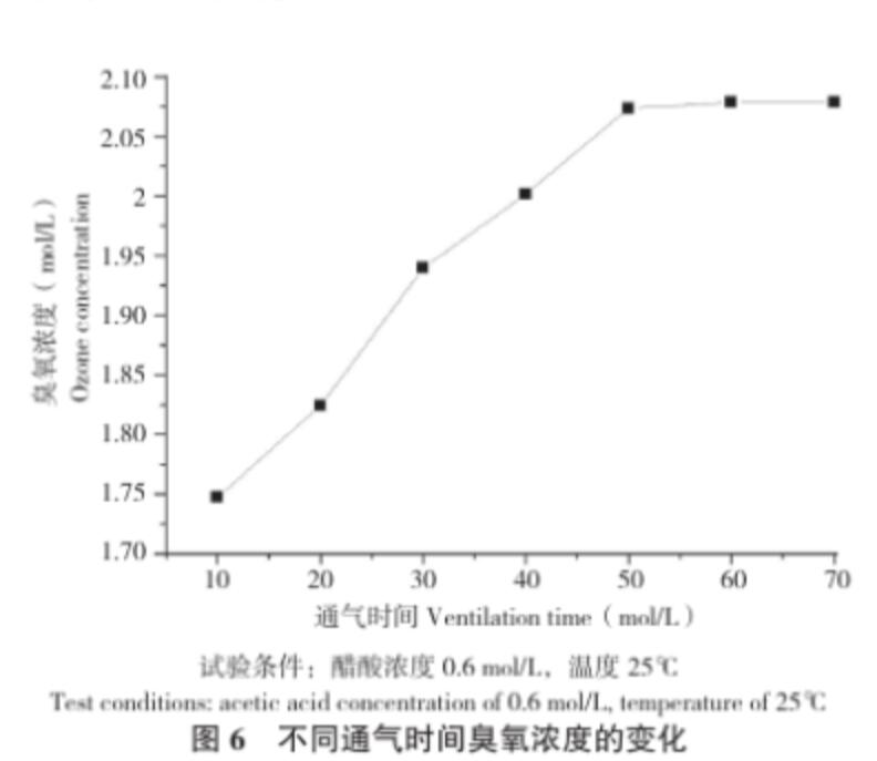 (6)配制濃度為0.6 mol/L的醋酸溶液,在溫度25℃的條件下,分別通入臭氧處理10、20、30、40、50、60、70 min,在每個時間段取樣測定樣品中的臭氧濃度。