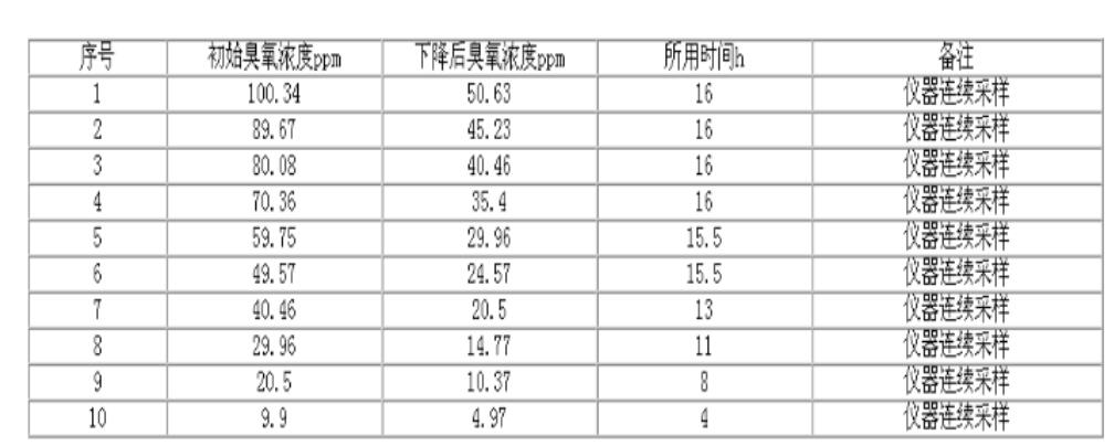 比利時臭氧專家W·J·馬舍蘭在《臭氧雨水的接觸和接觸器尾氣處理》文中認(rèn)為:臭氧在霧中的半衰期約為4~5h。國內(nèi)外一些臭氧資料中的半衰期相距很大。為此,我們用一容積為0.95mg/m3的玻璃柜,在環(huán)境溫度為20~25℃;環(huán)境溫度為60~80%Rh,臭氧濃度在200ppm以下的情況下做了一些實驗,現(xiàn)將結(jié)果抄錄如下。