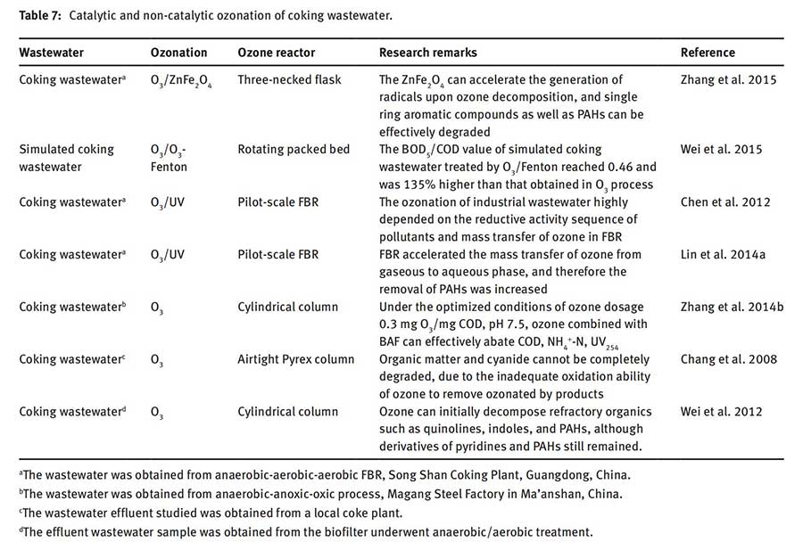 焦化廢水由于其復雜的組成和劇毒特性而受到了廣泛的關注。經過生物處理后,焦化廢水中仍殘留有酚類、苯類、多環芳烴(PAHs)和含氮雜環化合物。如表7所示,可以通過基于臭氧的技術有效地消除焦化廢水中的這些不可生物降解的有機污染物??梢园l現, 很關注的研究興趣在于降低焦化廢水出水的潛在風險,以及減少廢水中的有機污染物。通過與活性催化劑結合,提高臭氧的氧化能力。