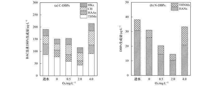 圖1進(jìn)水和不同臭氧濃度下BAC出水中DBPs的生成特征