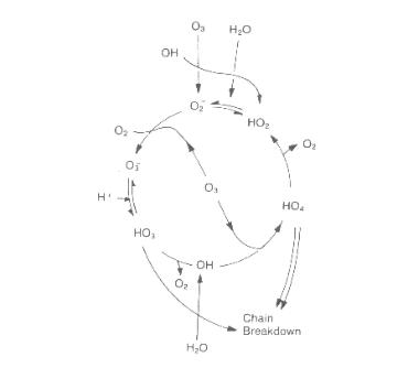 溶解的臭氧的穩(wěn)定性容易受pH,紫外線,臭氧濃度和自由基清除劑濃度的影響。在過量自由基清除劑存在下測量的分解速率(脂族和芳族)可以防止二次反應(yīng),這是通過偽一級動力學(xué)表示的。臭氧分解在鏈過程中發(fā)生,其可以由下面的圖1中所示的反應(yīng)表示(基于Staehelin等人,Tomiyasu等人的兩個 很重要的模型),包括引發(fā)步驟,傳播步驟和鏈?zhǔn)椒磻?yīng)步驟的中斷。 。