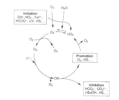 自由基反應(yīng)的引發(fā)劑是能夠從臭氧分子誘導(dǎo)形成超氧離子O2的那些化合物。這些是無機化合物(羥基離子OH-,氫過氧化物離子HO2 - 和一些陽離子),有機化合物(乙醛酸,甲酸,腐殖質(zhì)......)和253.7 nm的紫外線輻射。